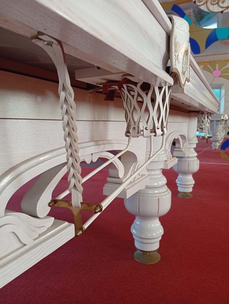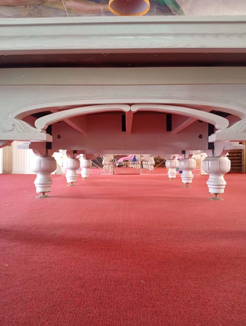 Стабильность усиливают винты ног увеличенного диаметра и литые латунные опорные чашки. Абсолютную горизонтальность поверхности обеспечивает юстировочная система с 50 регулировочными точками. Стол комплектуется высококачественным сукном бренда Manchester