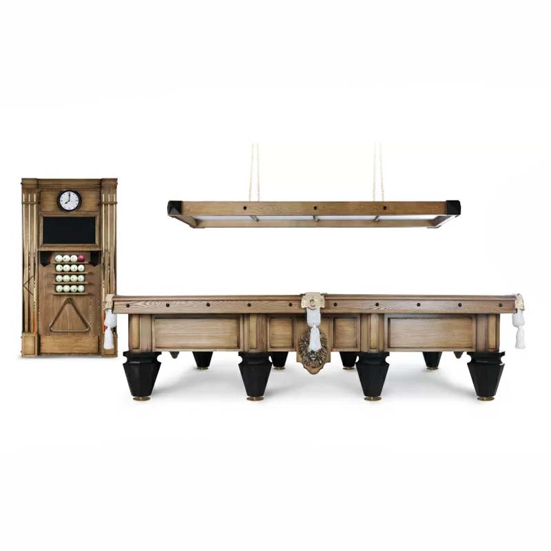 Стол выполнен из комбинации пород дерева: ясень/сосна/граб. В построении используется новая технология безупречного крепления борта к плите - Mount Perfect, которая гарантирует повышенную жесткость конструкции. Эффектные лузы отделаны кожей ручной работы с геральдическим тиснением.