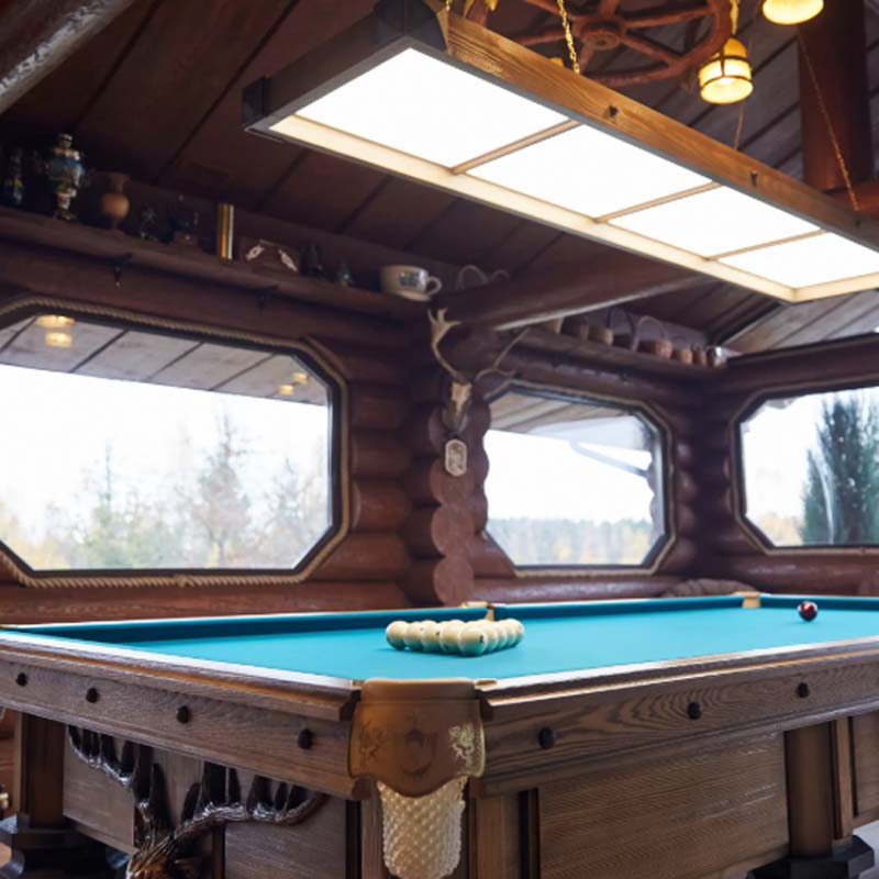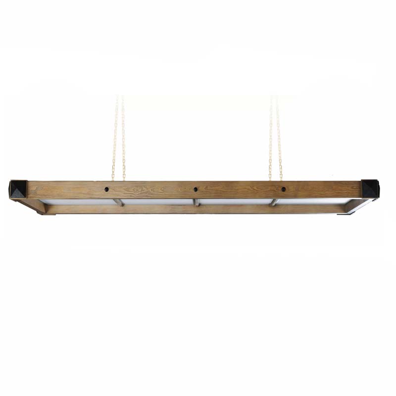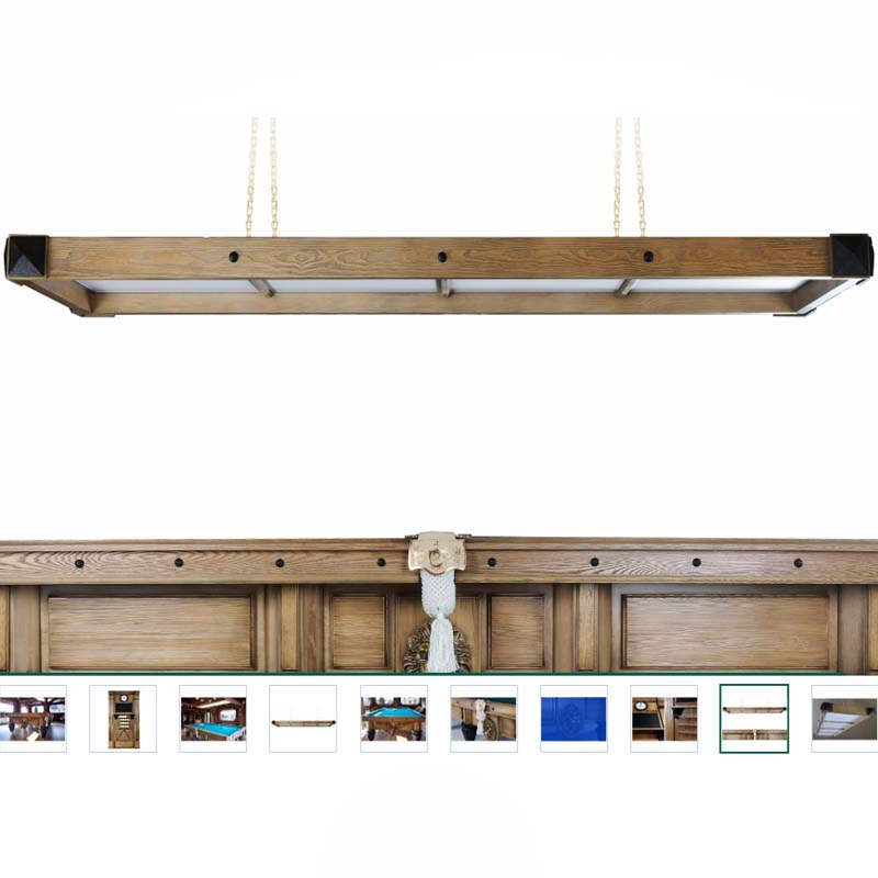 Выполнен в соответствии с эксклюзивным дизайном бильярдной коллекции «Охота». Модель состоит из четырех секций, дает равномерное освещение бильярдных столов 11 и 12 футов. Мягкий поток света обеспечивает равномерное и бестеневое освещение стола и максимально комфортные условия для игроков. Корпус светильника выполнен из массива сосны.Конструкция крепится к потолку с помощью подвесов, входящих в крепежный комплект.