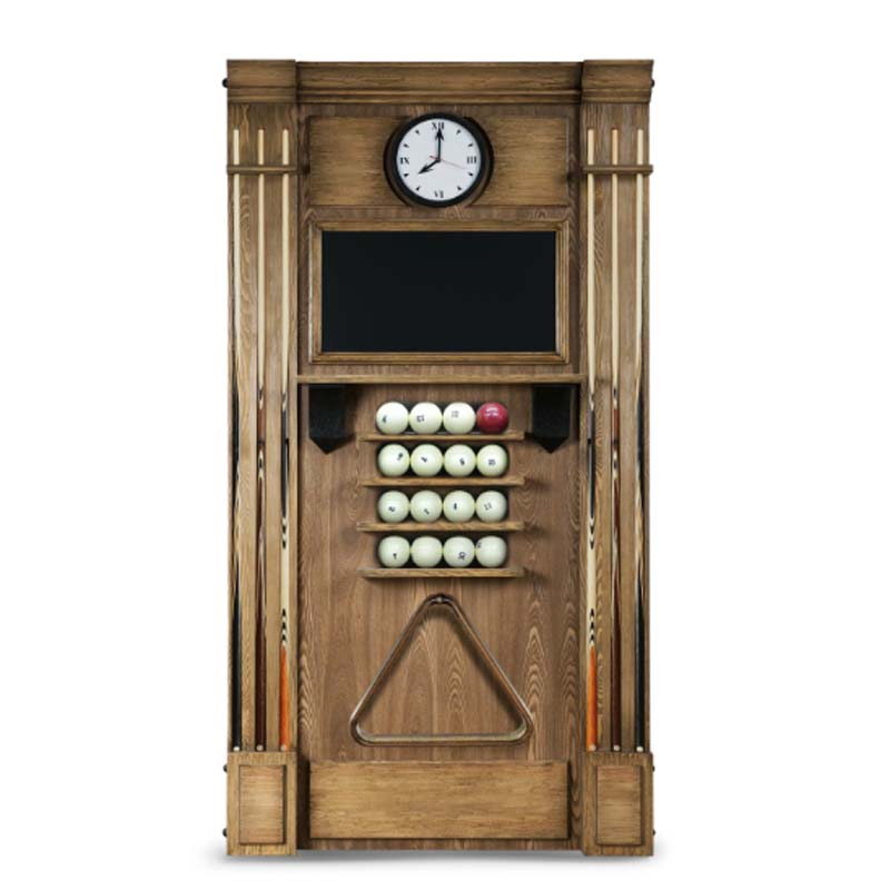 Изготовлена из массива сосны, выполнена в стиле бильярдного стола «Охота». Предназначена для хранения 6 киев. Полочки рассчитаны для хранения комплекта шаров и аксессуаров, предусмотрена доска для счета игры. В нижней части модели предусмотрен подвес для треугольника. Декоративным и функциональным элементом киевницы являются часы диаметром 250 мм.