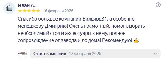 Спасибо большое компании Бильярд31, а особенно менеджеру Дмитрию!