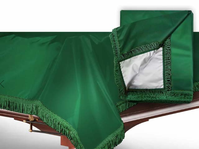 Этот чехол с влагостойкой пропиткой, обрамленный зеленой бахромой, надежно предохранит бильярдный стол от внешних воздействий..