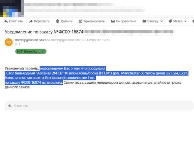 В последнюю неделю февраля на почту компании BiLLiARD31 поступило уведомление о готовности профессионального бильярдного стола АРСЕНАЛ - предоплата была внесена покупателем в декабре 2025 года.