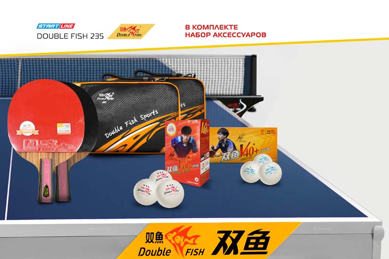 Стильный и лаконичный дизайн теннисного стола является еще одним преимуществом модели Double Fish 235 . Важно, что в комплекте со столом идет профессиональный набор аксессуаров для настольного тенниса. В набор входят сетка XW-924 для теннисного стола, две ракетки J8 c накладками ITTF в чехлах, а также мячи 6 шт 3* и 10 шт 1*.