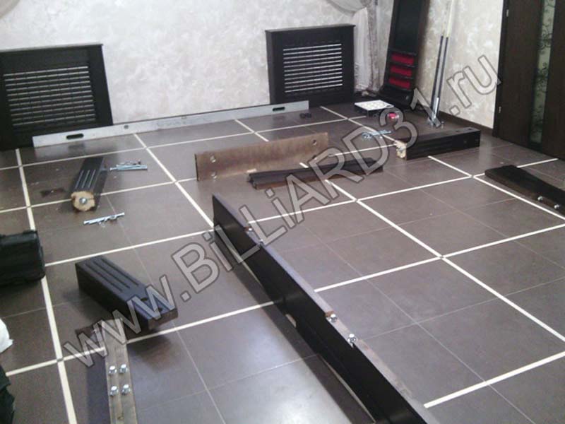 Собранный лафет стола - видны регулировочные болты (это стол профессиональной серии и для точного выравнивания бильярдных плит по уровню предусмотрены болты)