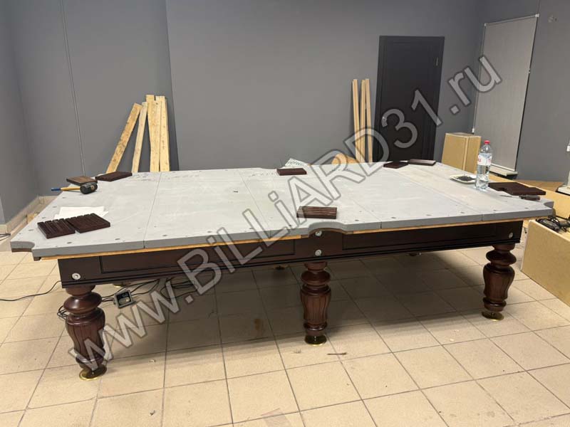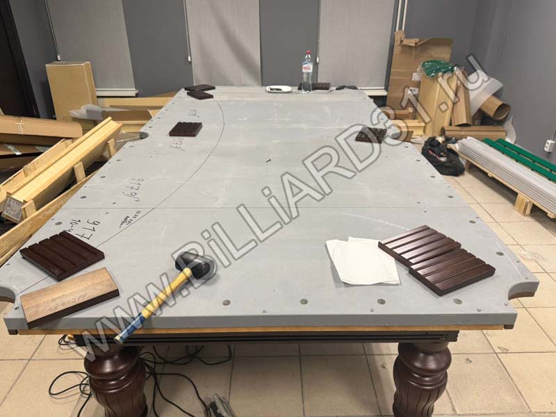 Сегодня был собран каркас бильярда, уложены плиты игрового поля и установлены пристрельные планки - к ним будет крепиться сукно. Толщина игрового поля составляет 40 мм, вес бильярдного стола - около 800 килограмм.