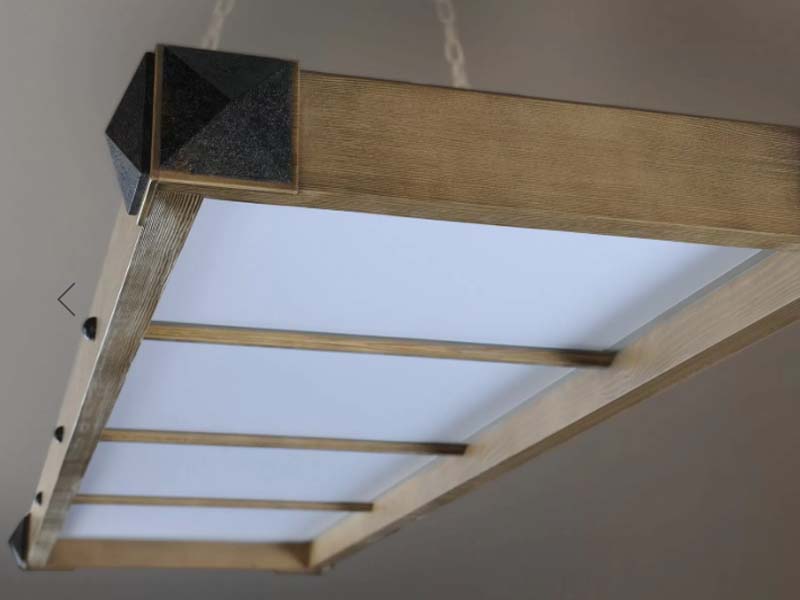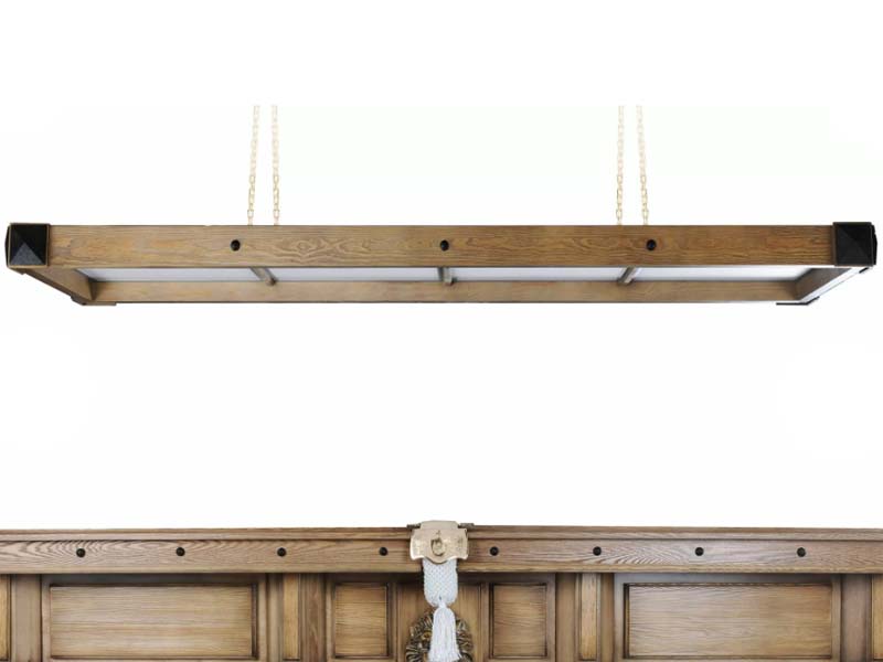 Светильник выполнен в соответствии с эксклюзивным дизайном бильярдной коллекции «Охота». Модель состоит из четырех секций, дает равномерное освещение бильярдных столов 11 и 12 футов. Мягкий поток света обеспечивает равномерное и бестеневое освещение стола и максимально комфортные условия для игроков. Корпус светильника выполнен из массива сосны.Конструкция крепится к потолку с помощью подвесов, входящих в крепежный комплект.